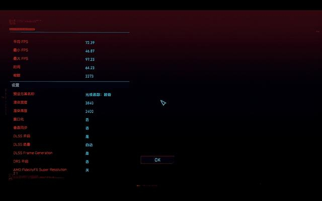 游戏选择了显卡杀手《赛博朋克2077》,直接将画质拉满。具体为:在4K分辨率下,选择最高选项光线追踪:超级,同时打开DLSS3,运行Bnechmark。最终得到平均72.39帧的成绩。这个成绩非常给力,这意味着游戏本已经在4K下征服了《赛博朋克2077》,在一年前是完全不敢想的。
