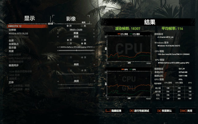 另外我还选择了对硬件要求比较友好的《古墓丽影:暗影》,同样将画质拉满,在4K分辨率下选择最高画质,运行Benchmark得到平均116帧的成绩,非常给力。