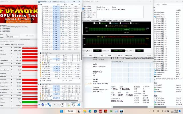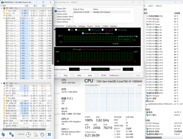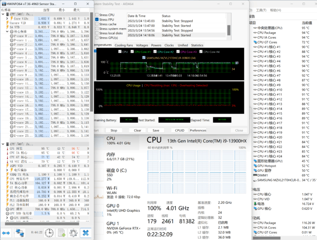 10分钟的压力测试显示,i9-13900HX的功耗可以稳定在105W左右,此时性能核频率为3.5GHz,能效核频率为3GHz,核心温度稳定在95℃上下。过程中会撞温度墙,温度墙应该是96℃。可以说处理器的性能释放给的还是比较足的,属于目前比较出色的水平。