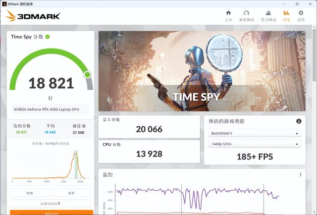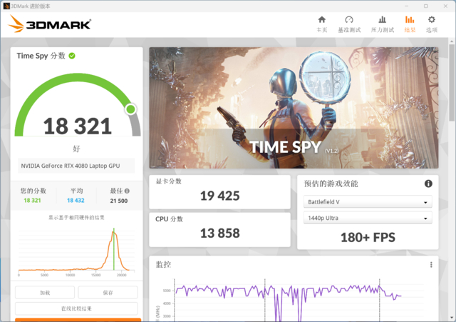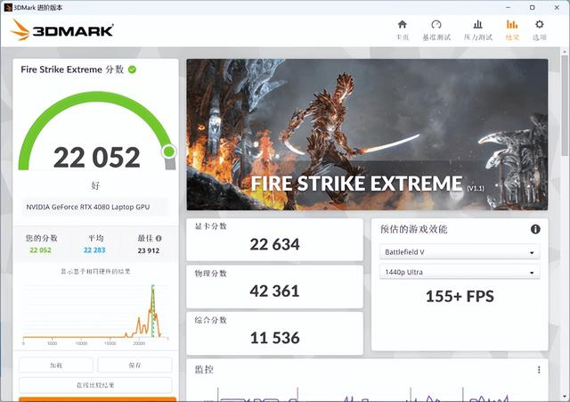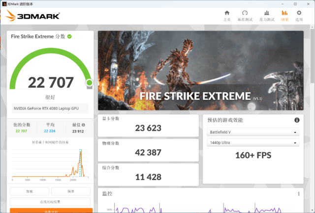 3DMARK实测Time Spy模式下总分18321、显卡分19425;Fire Strike Extreme模式下总分22052、显卡分22634。从两项得分来看,RTX 4080 Laptop的性能发挥正常,属于满功耗该有的水平。