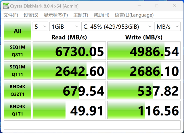 内存和硬盘方面,机械师曙光16 Pro采用了32GB DDR5 4800内存,为单条,来自三星,内部有两个内存插槽,为升级留足了空间;硬盘采用的是1TB PCIe4.0 SSD,为三星PM9A1,实测持续读取6730MB/s、持续写入4986MB/s,性能表现比较给力。内部同样有两个M.2硬盘位,支持升级。