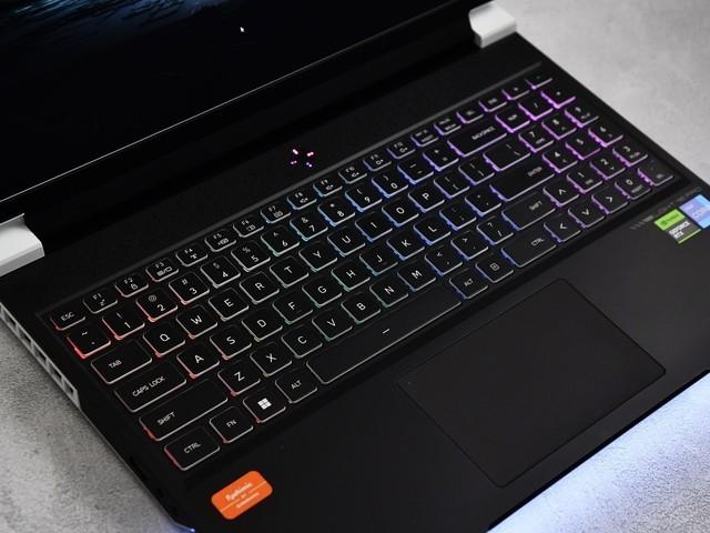 电源键也提供了四点背光,犹如游戏中的准星一样。键盘背光为四分区RGB,系统内置7种灯效,也允许用户自定义颜色、亮度和速度。