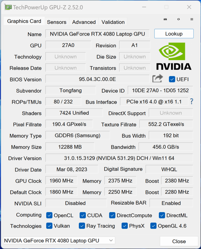 再看显卡,想必大家对RTX 4080 Laptop的了解会多一些,它拥有7424个CUDA核心,核心频率1960MHz,Boost频率2380MHz;显存为12GB GDDR6,来自三星,显存位宽192bit,显存频率2375MHz。英伟达控制中心显示功耗为175W。