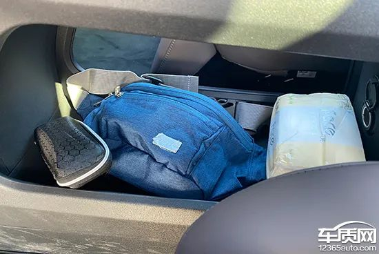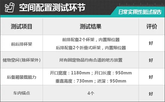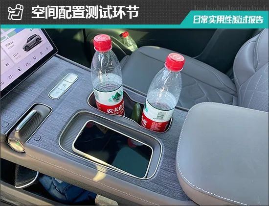 对于车内使用空间的测试,只针对前排触手可及的空间,不包括手套箱、中央扶手箱等需开启的空间。测试方法是将以下固定物品全部放置在前排的各个储物空间内,通过固定物品的放置情况来判断车辆储物空间的表现。测试选定的固定物品为:2瓶常规大小的矿泉水、1部大屏手机、1支口红、1个挎包、1副墨镜、1把折叠雨伞以及1包常规尺寸的抽纸。