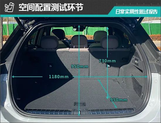此外,我们还对蔚来ES7的后备厢基础数值进行了实测,开口长度为950mm;开口宽度为1180mm;后备厢进深为950mm;后备厢地台与内部车顶的垂直高度为730mm。
