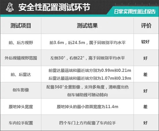 在车辆前、后方视野测试中,车内所有座椅均已调整至最低状态,所测出的数据与驾驶者正常使用时均有一些偏差,仅供参考。