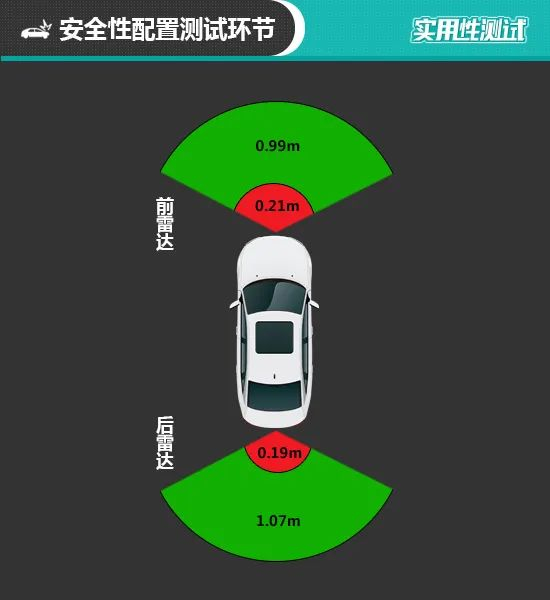 前驻车雷达最远可以在0.99m处感应前方物体,持续蜂鸣阶段最远距离为0.21m,虽比后雷达好一些,但仍与测试经验值存在差距。