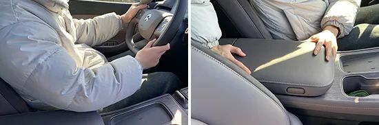 前排中央扶手采用柔软的皮质包裹,且面积较大,触感出色。同时,虽然中央扶手不支持调节,但驾驶者在扶握方向盘时依然能为手肘提供有效支撑。