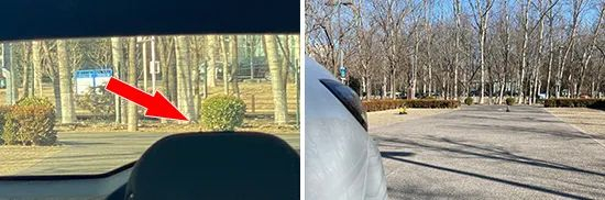 外后视镜视野范围测试时,首先让测试人员分别站在左右后视镜垂直10m处,随即开始向左右两侧移动,直至出现在两侧后视镜最外侧边缘为止,测出其横向距离。随后通过公式计算,便可以得出后视镜视野范围的夹角角度。角度越大则后视镜视野盲区范围越小,反之则后视镜视野盲区越大。