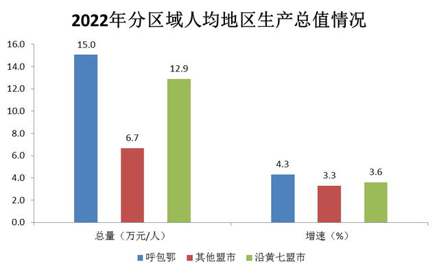 分区域看,呼包鄂人均地区生产总值150468元,高于全区53994元;比上年增长4.3%,高于全区平均增速0.1个百分点。其他盟市人均地区生产总值66724元,比上年增长3.3%。沿黄七盟市人均地区生产总值128761元,比上年增长3.6%。