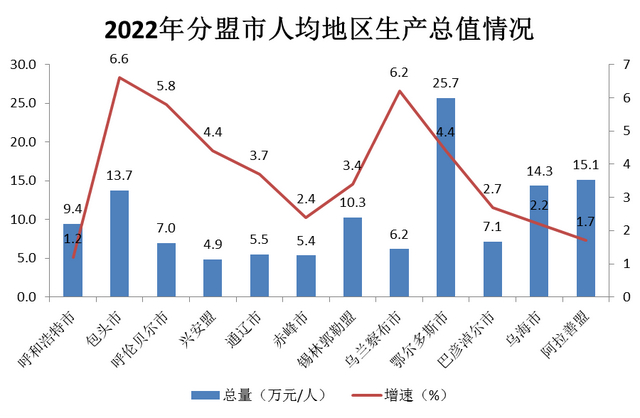 分盟市看,包头市、锡林郭勒盟、鄂尔多斯市、乌海市、阿拉善盟五盟市人均地区生产总值达到10万元以上水平。其中,鄂尔多斯人均地区生产总值突破25万元,达256908元;锡林郭勒盟人均地区生产总值突破10万元,达102558元;包头市、乌海市、阿拉善盟人均地区生产总值分别为137360元、143450元、150848元。