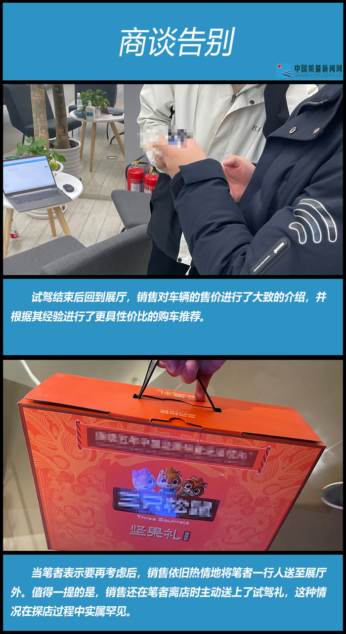 该飞凡体验店的展厅在设计方面没有展现太多品牌特色,因此没有留下过多记忆点。服务方面,该销售整体的服务态度不卑不亢,始终与笔者保持礼貌的距离。同时他具有较高的主动服务意识,尤其是离店时主动提供试驾礼品,这在笔者近几年的探店过程中属于首次,这也会给消费者留下深刻的印象和好感。