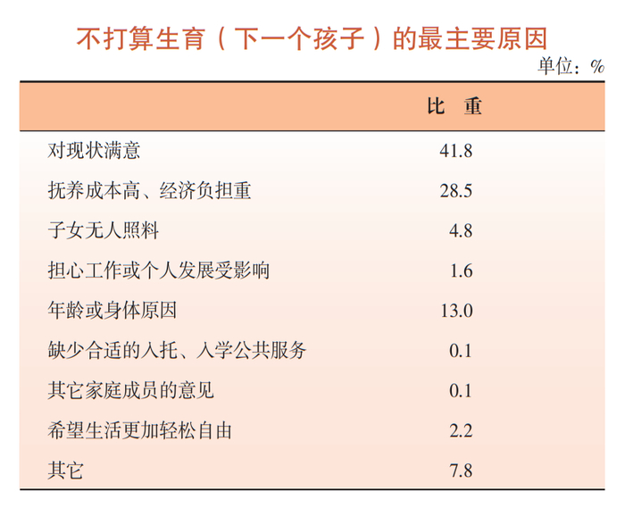 关于不打算生育(下一个孩子)的最主要原因,统计显示,有41.8%的人是对现状满意,有28.5%的人则是因为抚养成本高、经济负担重。