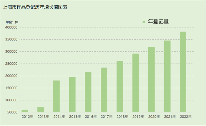 作品登记工作是版权公共服务的一项重要内容。近年来,上海市版权局作品登记数量连年增幅8%以上。在国家版权局发布的《国家版权局关于2022年全国著作权登记情况的通报》中,2022年上海作品登记量38.2万件,占全国总量的8.46 %,稳居全国前列。
