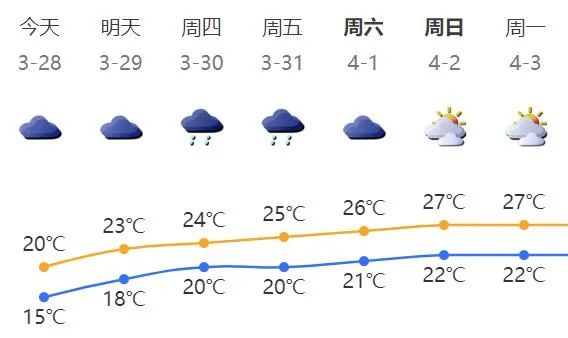 未来五天间中仍有阵雨,气温逐步回升。29日有分散小雨,早晚仍较清凉;30-31日有(雷)阵雨,部分时间雨势较大。4月1-3日多云为主,气温明显回升,天气暖湿有轻雾。