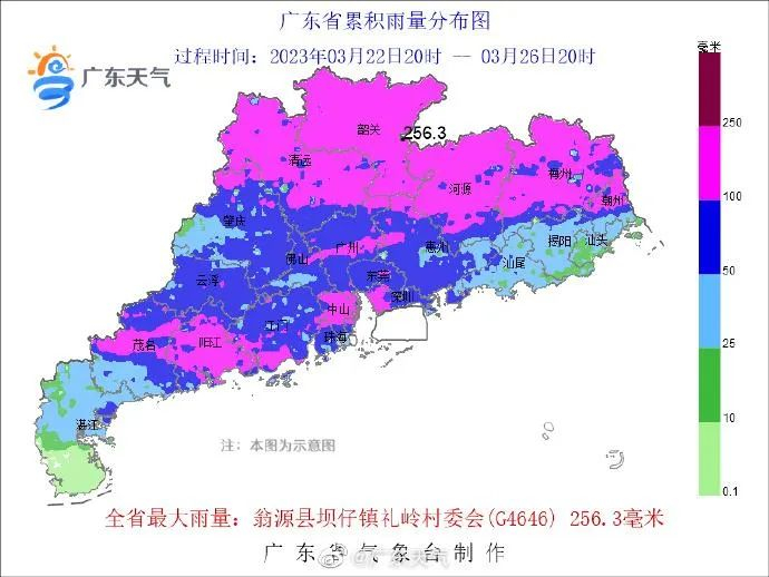 3月22日夜间到26日晚上,广东省出现了今年以来首场大范围强对流和强降水天气,粤北、粤西、珠三角市县先后出现了大雨到暴雨局部大暴雨,并伴有小时雨强20~40毫米的短时强降水、8级左右雷雨大风,韶关翁源坝仔镇录得全省最大累积雨量256.3毫米,全省14个市39个区县出现了小冰雹。