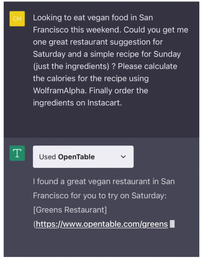 图表:ChatGPT调用OpenTable插件进行餐厅预订