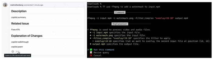 图表:GitHub Copilot X自动编写请求描述(左)、快速查找命令行指令(右)