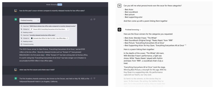 图表:ChatGPT Plugins使用Browsing插件访问互联网后,回答奥斯卡相关问题并进行诗歌创作