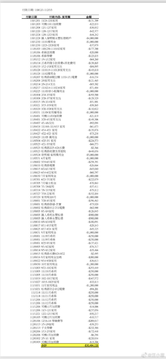 前妻大S(徐熙媛)向前夫汪小菲起诉讨要750万元(新台币,下同)生活费,27日台北地院一审判决汪小菲败诉。3月27日晚,汪小菲在个人社交媒体晒出之前支出明细账单,并回应表示会继续上诉。