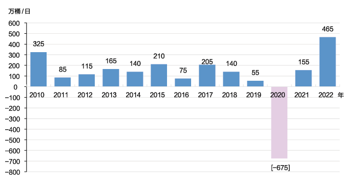 尽管如此,全球石油供应增量创下历史最高水平(见图6)。由于油价高企刺激了非“欧佩克+”国家和地区产量急剧增长,世界石油供应总量达到1亿桶/日。实际增幅突破5%,不但远远高于2021年1.6%的产量增幅,也大大高于全球需求2.2%的增幅。在465万桶/日的全球原油供应增量中,非“欧佩克+”国家和地区增加165万桶/日,80%以上来自美国和加拿大;“欧佩克+”在持续减产的政策背景下比2021年产量高出300万桶/日,其中2/3来自沙特阿拉伯、阿联酋和伊朗。