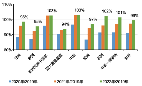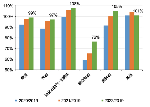 乌克兰危机爆发前,市场普遍预期2022年世界石油需求将恢复至新冠病毒疫情前水平。乌克兰危机爆发后,全球石油需求复苏进程大大推后,主要是由于全球能源价格高企、主要国家通胀罕见、美联储鹰派加息、货币政策普遍被动收紧、全球经济动能趋弱,以及中国疫情“净零”管控和年底“大爆发”等诸多因素阻碍石油需求的复苏步伐。世界石油需求全年增幅放缓,大大低于预期和供应增量,只增长2.2%(215万桶/日),需求总量为9980万桶/日,总体上恢复到疫情前的99%(见图4)。从终端消费看,汽柴油和燃料油需求恢复较好,已经接近甚至超过疫情前水平;唯独航空煤油需求量只相当于疫情前的3/4(见图5),说明疫情对人员的国际交往和国家间的信任等负面影响还远远没有消除。