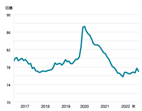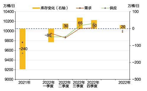 从各季度供需平衡看,2022年一季度石油市场缺口为80万桶/日,市场持续去库存,以动用库存满足需求增长;二季度之后,受高油价刺激,全球原油产量猛然增加。由于全球石油需求增长遇阻、“欧佩克+”渐进增产、俄罗斯供应减少并不明显,全球石油供应增量远远大于需求增量。超出需求的富余产量开始陆续进入库存。季度供需平衡变化数据显示,2022年二至四季度全球库存增量均在30万桶/日之上(见图7)。