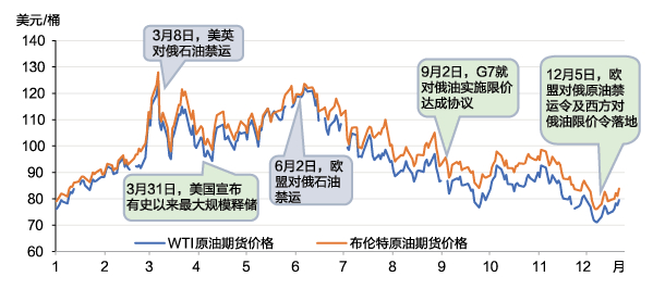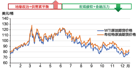宏观经济疲软及金融压力主导2022年下半年油价跌势。由于美联储连续强势加息、全球经济降速、新冠疫情反复无常,油价承压震荡回落。2022年12月5日,欧盟对俄罗斯原油禁运令生效,西方对俄罗斯原油限价“软落地”,进一步施压油价。2022年底油价基本完全回吐年内涨幅,回到80美元/桶底线(见图1)。布伦特原油全年均价为99.04美元/桶,比上年上涨39.6%(约28.09美元/桶),年均价接近2014年的水平。