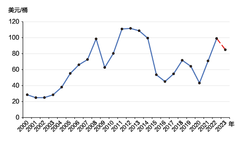 综合判断,2023年宏观经济下行仍是国际油价面临的最大压力;同时,尽管地缘政治风险溢价减弱,但世界石油市场基本面维持紧平衡、欧美强势货币政策可能缓解油价下降压力。长期以来,所谓“合理”的油价水平应该是70~80美元/桶。2010年至今,布伦特油价平均为80美元/桶,目前油价也处在80美元/桶。因此,2023年年均油价为80美元/桶将是供需双方都可以接受的水平。基准情景下,布伦特原油均价范围在80~90美元/桶(见图14)。