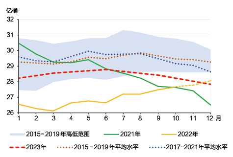 2023年,世界石油需求量预计增加170万桶/日,达到10150万桶/日,超过疫情前水平。尽管全球经济增速放缓,但中国经济“正常化”和需求修复将给世界石油市场带来提振和利好。在供应侧,各方将持续博弈。预计在西方制裁下俄罗斯石油降量有限、“欧佩克+”维持现有产量政策、对伊朗制裁不取消的情况下,世界石油供应量比上年缓慢增长130万桶/日。石油市场基本面将延续紧平衡状态。基准情景下,世界石油市场供应量比需求量少20万桶/日,石油库存先涨后降,整体小幅下降(见图13)。