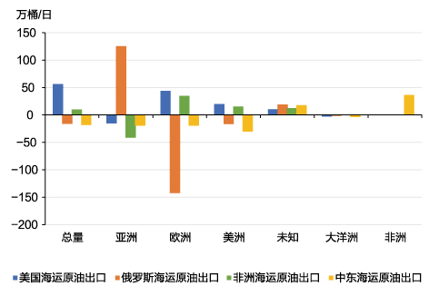 因西方制裁,俄罗斯海运原油出口量总体减少16万桶/日,减少量低于市场普遍预期。俄原油流向呈现出明显的“西降东升”趋势。其中,对欧出口大幅减少140万桶/日,而出口到印度、中国等亚洲国家和未知目的地的原油则大增126万桶/日。同时,欧洲加大非俄油源进口,导致国际原油贸易呈现出“东降西升”特点。美国和非洲出口至欧洲的原油量大增,分别增加44万桶/日和35万桶/日;美国和非洲出口至亚洲的原油量明显减少,分别减量15万桶/日和42万桶/日。尽管中东没有增加对欧原油出口量,但是因俄原油迅猛进入亚洲,中东原油在亚洲丧失了近20万桶/日的份额;中东出口至非洲的原油量增加了近40万桶/日,完全替补了非洲因增加对欧出口量而导致的市场缺口(见图3)。2022年12月5日对俄海运原油禁运令和原油限价令生效后,这种趋势进一步演进,全球原油贸易格局进一步重塑。
