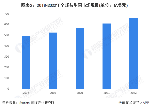 根据Statista的数据显示,2018-2022年全球益生菌行业的市场规模呈现逐年增长的状态。2022年全球益生菌行业市场规模约达660亿美元,较2018年的494亿美元增长近33.6%,年均复合增速达7.5%。