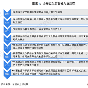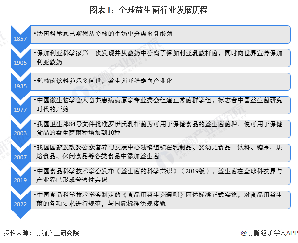近代全球益生菌行业的发展主要起源于1857年法国科学家巴斯德分离出了乳酸菌。1935年,乳酸菌饮料问世标志着益生菌行业走向产业化。1977年起我国开始研发益生菌,中国食品科学技术学会制定的《食品用益生菌通则》团体标准正式实施,对食品用益生菌的基本要求、菌株水平、生产过程、技术要求、贮存和运输、在食品中的应用及标签标识等内容进行规范,在与国际标准法规接轨的同时,满足了现阶段我国益生菌行业创新发展的需求。