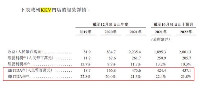 要看整体盈利状况,选取经营亏损这一指标更为直观。2019、2020、2021及2022年前十月,经营利润分别为-0.88亿元、-1.425亿元、-2.375亿元及-1.596亿元。对应到在营收中的占比,会发现KK集团亏损率正呈逐年显著下降的趋势,分别为-19%、-8.66%、-6.74%、-5.2%。