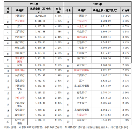 债券承销方面,根据彭博数据显示,2022 年中资券商承销离岸债规模前三分别为中信证券、中金公司及海通国际,三家的市占率分别为4.56%、4.55%、 3.46%,均较2021年有所提升。