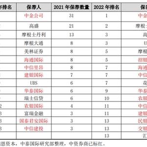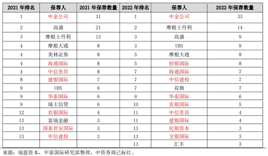 根据瑞恩资本披露数据,2021年至2022年按保荐项目书排名的排名前13名中,中资比例连续两年超过50%,中金公司连续两年排列第一。