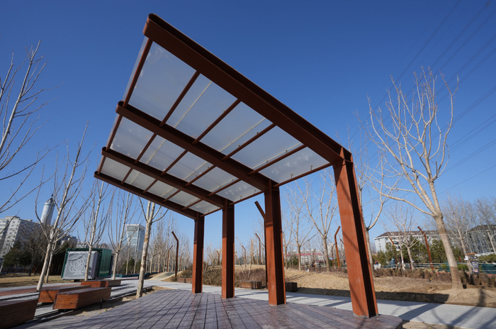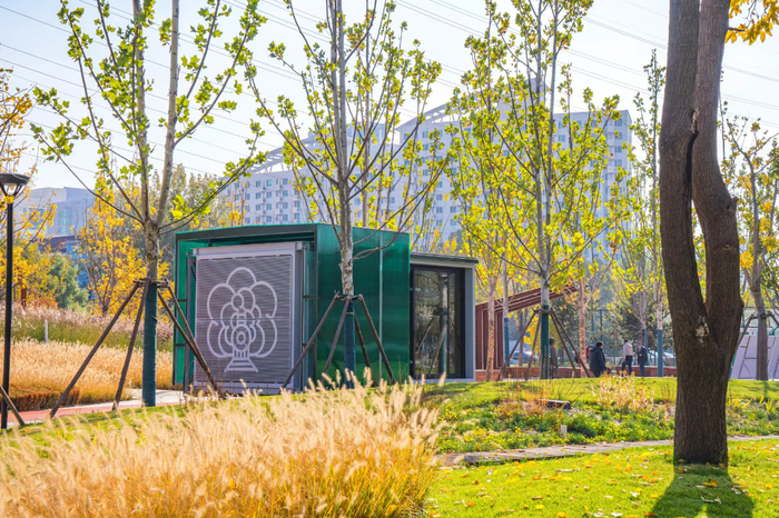 京张高铁的检修井也被完美地利用上,南侧的墙体上安装着两扇斑驳的绿色木门——铁路系统捐赠的原件,西侧的墙面上装饰了方形、圆形的原木,把火车货场搬到了公园里,仿佛打开门,列车就能从门后呜呜呜地驶出。