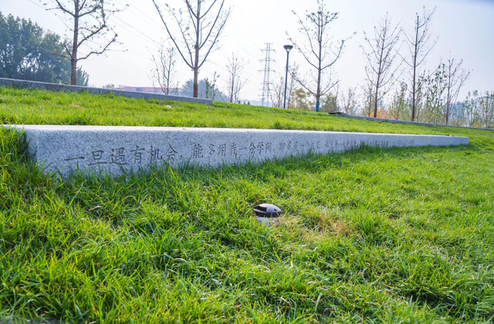 环丘的石头上都“暗藏玄机”,比如12块卧石上篆刻着京张铁路的“一生”,弧形条石“座椅”内侧也镌刻着詹天佑、孙中山、容闳等人关于铁路的语句。时不时有家长带着孩子蹲在石头处细细品读,阅读着百年前围绕京张铁路展开的故事。