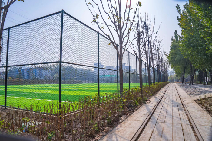 公园不仅是公园:靠近13号线的地方被辟出一条宽约4米的自行车道,彩色沥青的跑步道在公园内蜿蜒,漫步道更是散落在公园的各个区域,串联起11.8公顷的绿地,还有绿地中的足球场、篮球场、乒乓球场以及设计独特的“平地”蹦床、攀爬网等儿童设施,“三道一绿”,可通行、可运动、可赏景、可嬉戏、可休闲,这里是一个开放共享的城市复合公共空间。