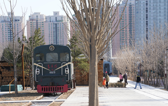 “这些铁轨是京张铁路拆除时遗留的,当时有部分存放在了北京焊轨厂,经过协商,铁路部门将大批旧钢轨捐赠用于公园建设。”张璐介绍,公园里还有一个“镇园之宝”——编号为0023号的“东方红2型”内燃机车车头,这也是由铁路部门捐献的,该机型目前全国只有5台。