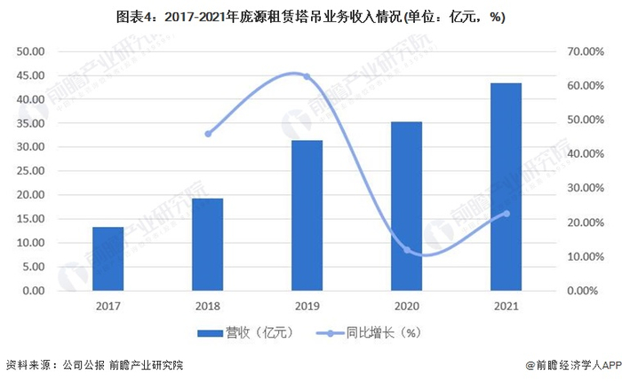 从塔吊业务的营收来看,2017-2021年,庞源租赁的塔吊业务收入逐年增加。2021年,塔吊业务营收达到43.34亿元,同比增长22.75%。