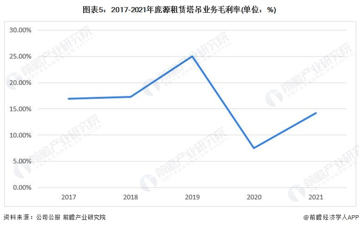 从塔吊业务毛利率来看,2017-2019年,庞源租赁塔吊行业毛利率逐年增加;2020年,公司行业毛利率有所下降。2021年,公司毛利率为14%左右,较2020年有所回升。