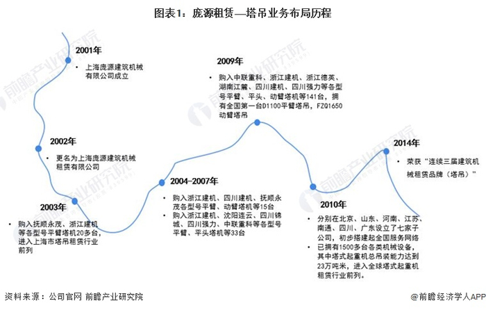 2001年 1月,上海庞源建筑机械有限公司成立;2002年 10月,公司更名为上海庞源建筑机械租赁有限公司。2003年开始,购入塔机,进入上海市塔吊租赁行业前列;2010年,进入全球塔式起重机租赁行业前列