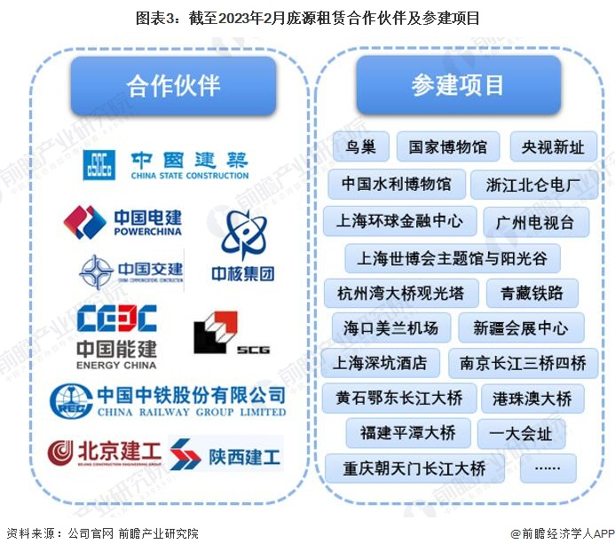 庞源公司拥有各类施工机械近万台,长期服务于中国建筑、中国电建、中国能建、中铁、中交、中核、上海建工、北京建工、陕西建工等大型央企、国企及上市公司,曾参建了鸟巢、国家博物馆、央视新址、中国水利博物馆、上海环球金融中心、上海世博会主题馆与阳光谷、广州电视台、黄石鄂东长江大桥、重庆朝天门长江大桥、南京长江三桥四桥、港珠澳大桥、福建平潭大桥、青藏铁路等诸多地标性建筑和国家重点工程项目,以及成千上万栋住宅楼。