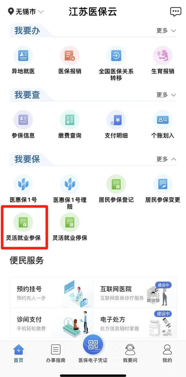应用商店或App Store搜索下载“江苏医保云”,注册后登录,选择“我要保”-“灵活就业参保”。