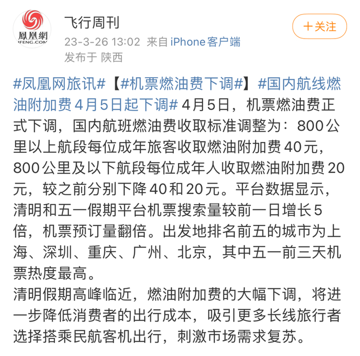 不止国际机票整体回落,3月26日,有消息称国内机票燃油附加费将自4月5日进一步下调,其中国内航班燃油费收取标准调整为800公里以上收取燃油附加费40元,800公里以下收取20元,较之前分别下降40元及20元。
