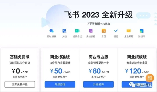 具体而言,对比钉钉、企业微信,飞书的免费版是三强之中功能最少的;收费版本也仅支持500人以下的企业购买,500人以上要开通旗舰版,而钉钉的专业版并没有限制人数使用,同时,按照500人的标准推算,钉钉没人每月1.63元,而飞书却达到了50人/每月,另外,要使用飞书OKR和飞书人事等模块儿又要另外付费。