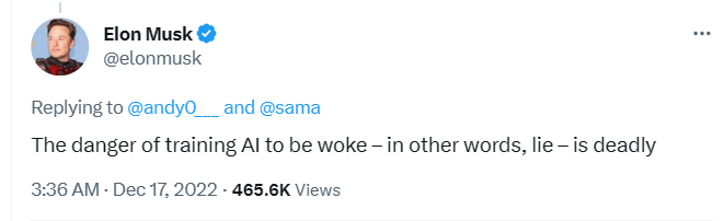 “Woke”这个词最先是埃隆·马斯克在推特上提出的。他写道,“训练AI觉醒的风险,换句话说就是训练其撒谎,是相当致命的”。