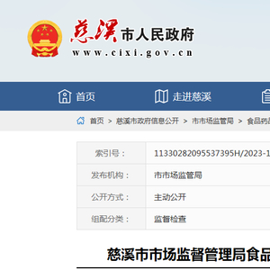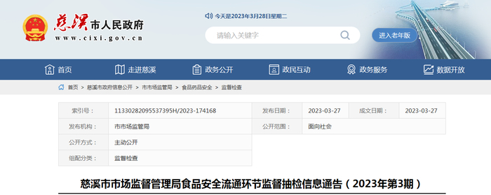 浙江省慈溪市市场监管局发布食品安全流通环节监督抽检信息(2023年第3期)
