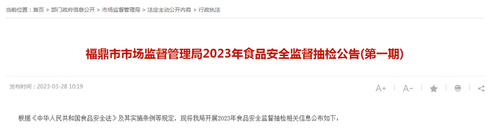 福建省福鼎市市场监管局发布2023年食品安全监督抽检公告(第一期)